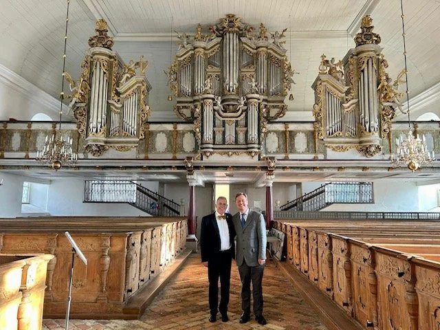 Juan Paradell Solé och Mathias Kjellgren framför Cahmanorgeln i Leufsta Bruks kyrka